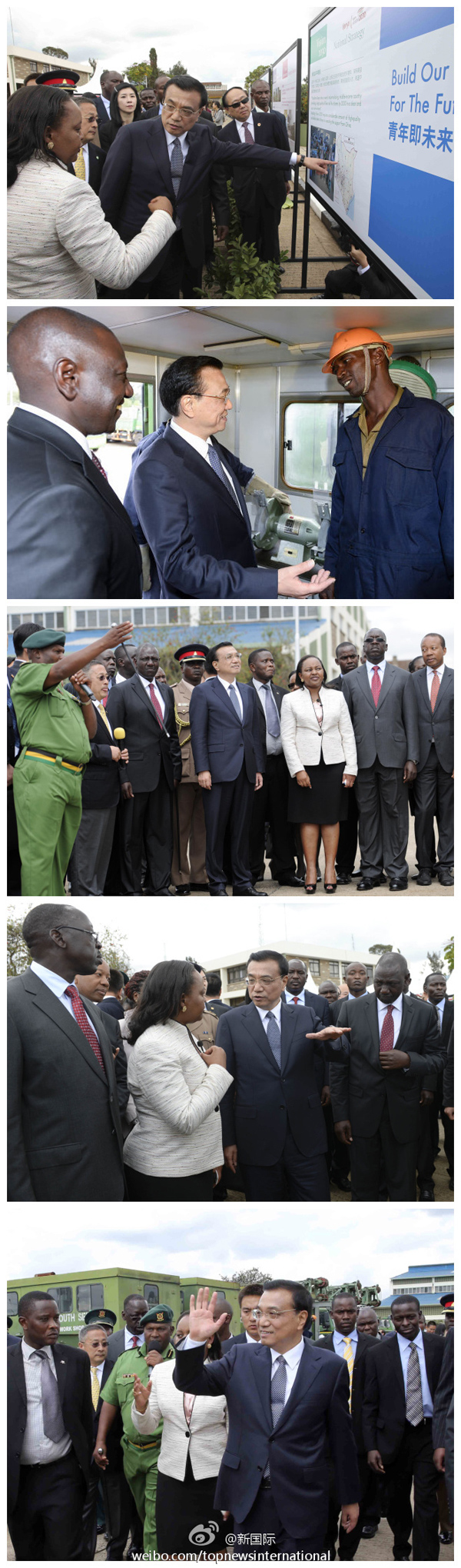 ????新華網(wǎng)北京5月11日電 據(jù)新華社“新國際”微博報(bào)道,李克強(qiáng)總理11日在肯副總統(tǒng)魯托陪同下到國家青年服務(wù)隊(duì)參觀。這里供學(xué)員實(shí)習(xí)的鉆井、起重、消防等裝備不少來自中國。李克強(qiáng)攀上一輛移動維修車查看并詢問維護(hù)等服務(wù)情況。他說,要用好中國裝備和技術(shù)優(yōu)勢,幫助非洲青年提升職業(yè)技能,促進(jìn)當(dāng)?shù)鼐蜆I(yè)。?