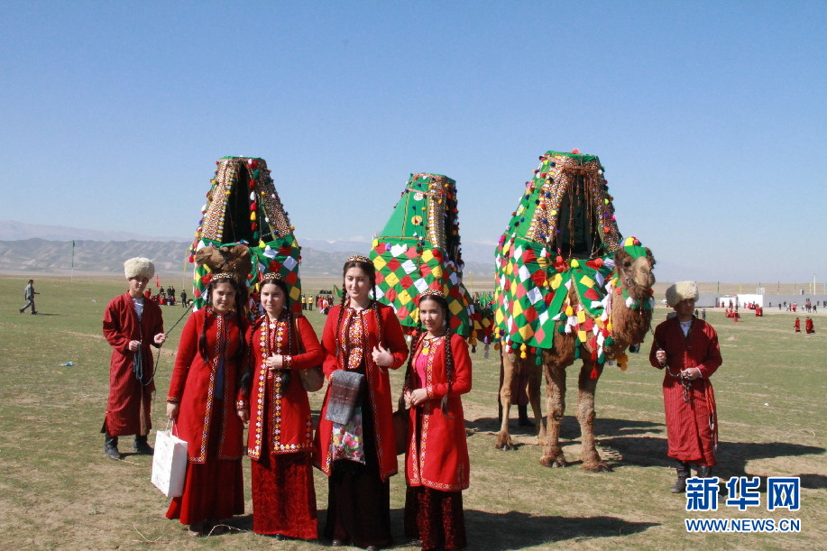 ????記者還看到過20來頭駱駝組成的駝群,其中頭駱身上綁著個布袋。駱駝低頭吃草,頭駝警覺地給它們站崗放哨。不一會兒,一些駱駝走到頭駝身前,向它施貼臉禮,頭駝一一回禮。當(dāng)記者試圖靠近時,頭駝發(fā)出低沉的怪聲,群駝迅速抬起頭來,慢慢地朝遠(yuǎn)方走去。在過節(jié)時,牧民小伙穿上紅色條狀長袍,頭戴白色羊羔皮帽,手牽的駱駝身上裹著人工織的毛毯,背上架著花轎,花轎中坐著美麗少女,少女頭戴小帽,梳著兩根長辮,身穿蓋過腳面的長裙。這是在給節(jié)日助興。同時,這也是土庫曼斯坦民族婚禮中迎娶新娘的一個縮影。在現(xiàn)實(shí)生活中,城市人很少見到駱駝。于是在各種活動中,跟打扮得如此漂亮的駱駝合影也是一件趣事。