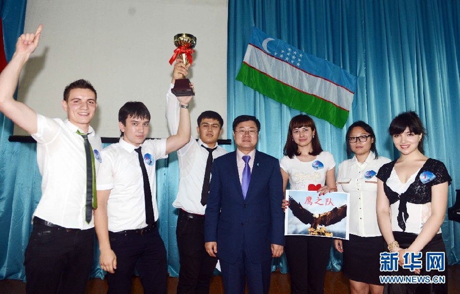 ??? 6月9日,烏茲別克斯坦首都塔什干的烏世界語言大學禮堂,中國駐烏茲別克斯坦使館孫立杰大使在向獲得冠軍的鷹之隊頒獎并合影留念。。