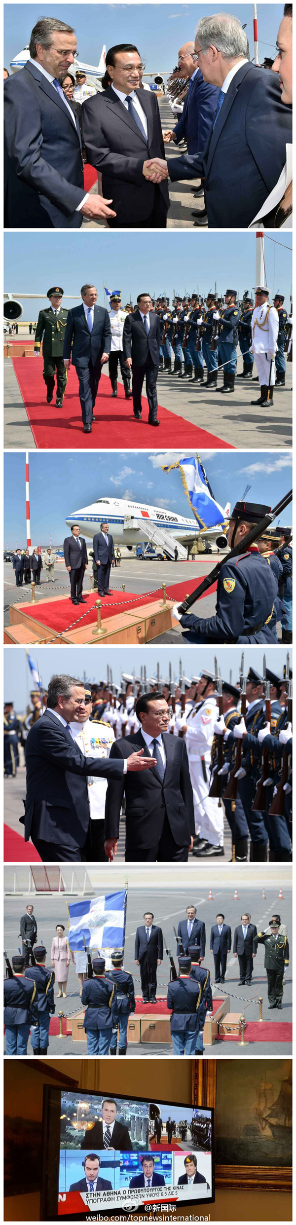 新華網(wǎng)北京6月20日電 據(jù)新華社“新國際”微博報道,李克強總理偕夫人程虹19日下午乘專機抵達雅典,開始對希臘的正式訪問,希臘總理薩馬拉斯和夫人到機場迎接?,F(xiàn)場奏響中希兩國國歌,李克強在薩馬拉斯陪同下檢閱了儀仗隊。希臘是西方文明發(fā)源地,這是李克強總理首次訪希,將推進雙方海洋、文化等領域合作。