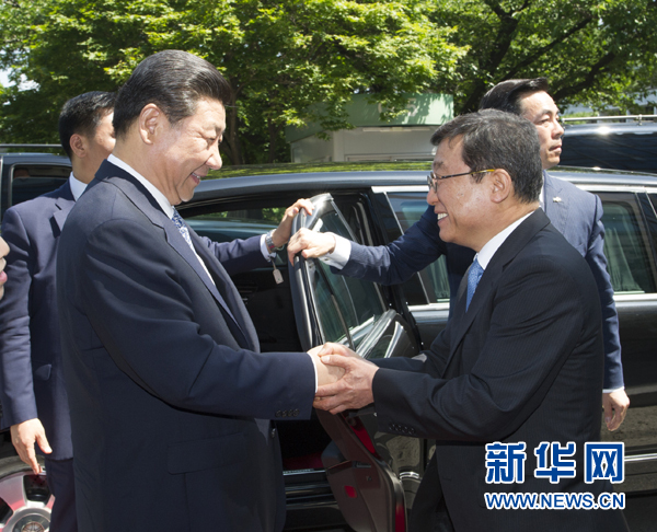 ????7月4日,國(guó)家主席習(xí)近平在韓國(guó)國(guó)立首爾大學(xué)發(fā)表題為《共創(chuàng)中韓合作未來(lái) 同襄亞洲振興繁榮》的重要演講。這是首爾大學(xué)校長(zhǎng)吳然天迎接習(xí)近平主席。新華社記者 謝環(huán)馳 攝