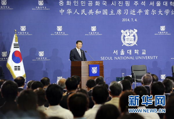 ???? 7月4日,國(guó)家主席習(xí)近平在韓國(guó)國(guó)立首爾大學(xué)發(fā)表題為《共創(chuàng)中韓合作未來(lái) 同襄亞洲振興繁榮》的重要演講。 新華社記者 蘭紅光 攝