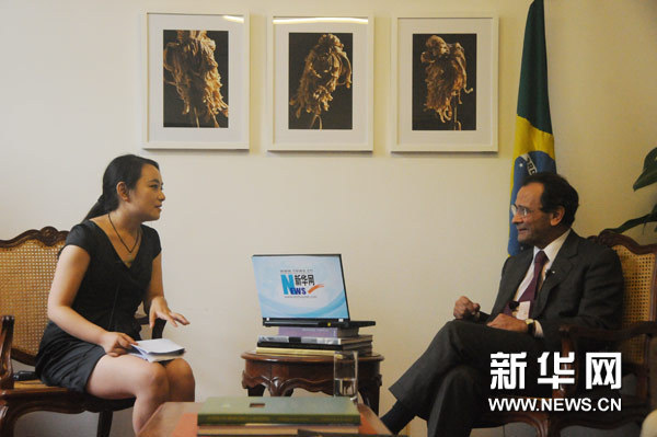 ??? 圖為巴西駐華大使瓦爾德馬爾·卡爾內(nèi)魯·萊昂(右)接受新華網(wǎng)專訪。新華網(wǎng)記者 劉小軍攝