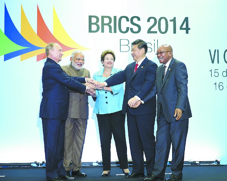 15日,國(guó)家主席習(xí)近平在巴西出席金磚國(guó)家領(lǐng)導(dǎo)人峰會(huì)。圖為5國(guó)領(lǐng)導(dǎo)人集體合影。新華社發(fā)