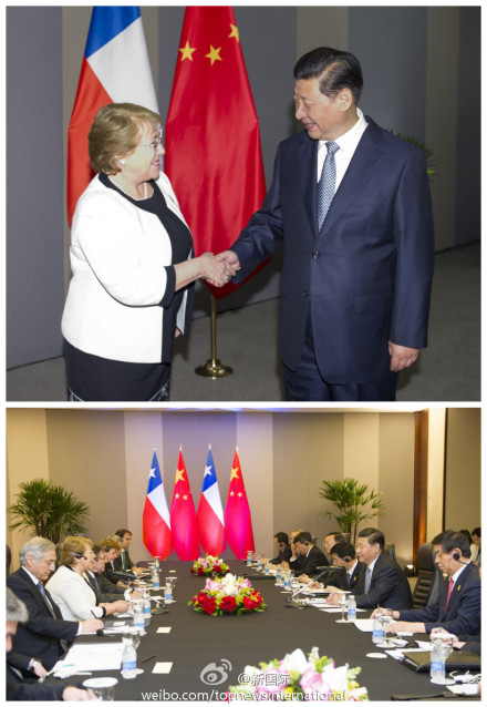 ??? 新華網(wǎng)北京7月17日電 據(jù)新華社“新國際”微博報道,習(xí)近平主席16日在會見智利總統(tǒng)巴切萊特時說,新形勢下,中智雙方要深挖雙邊貿(mào)易增長潛力,不斷加強(qiáng)重點(diǎn)領(lǐng)域投資合作,同時深化金融合作,形成以金融為引擎,貿(mào)易和投資兩個輪子一起轉(zhuǎn)的中智務(wù)實(shí)合作格局。(攝影:王曄、謝環(huán)馳)?
