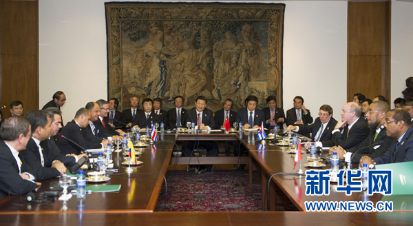 ??? 當?shù)貢r間7月17日,國家主席習近平在巴西利亞會見拉美和加勒比國家共同體輪值主席國哥斯達黎加總統(tǒng)索利斯、前任輪值主席國古巴國務委員會主席兼部長會議主席勞爾·卡斯特羅、候任輪值主席國厄瓜多爾總統(tǒng)科雷亞、加勒比共同體輪值主席國安提瓜和巴布達總理布朗。新華社記者 謝環(huán)馳 攝