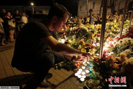 資料圖:7月17日,烏克蘭基輔,民眾們手持鮮花和蠟燭在荷蘭駐烏大使館前悼念馬航MH17事故遇難者。據(jù)稱(chēng),該架飛機(jī)上所載人數(shù)為298人,而此前報(bào)道稱(chēng)飛機(jī)上共載295人。由于此次事件可能導(dǎo)致地面人員傷亡,總共的遇難人數(shù)將超過(guò)300人。
