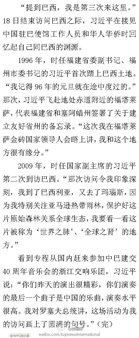 新華網(wǎng)北京7月19日電? 據(jù)新華社“新國(guó)際”微博報(bào)道,“提到巴西,我是第三次來(lái)這里。”18日結(jié)束訪問(wèn)巴西之際,習(xí)近平在接見(jiàn)中國(guó)駐巴使館工作人員和華人華僑時(shí)回憶起自己同巴西的淵源。