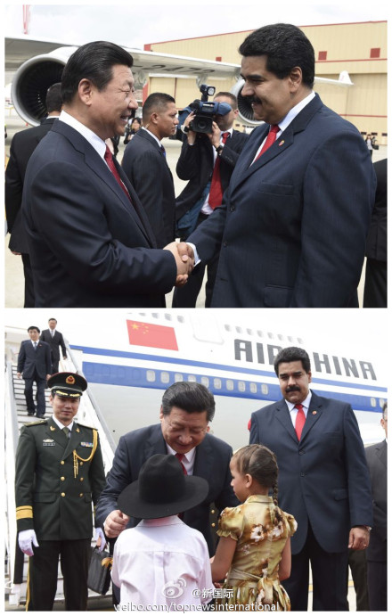 ????新華網(wǎng)北京7月21日電 據(jù)新華社“新國際”微博報道,經(jīng)過近7小時飛行,習近平主席當?shù)貢r間20日下午飛抵加拉加斯。專機進入委領空后,委空軍2架蘇-30戰(zhàn)機升空護航。馬杜羅總統(tǒng)親自到機場迎接。隨后,歡迎儀式在機場隆重舉行,習近平在馬杜羅陪同下檢閱儀仗隊。