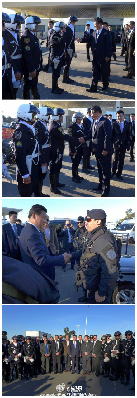 ????新華網(wǎng)北京7月21日電 據(jù)新華社“新國際”微博報(bào)道,43小時(shí)的阿根廷之旅,佩戴頭盔、全副武裝的騎警們一路護(hù)衛(wèi),十分辛苦。20日上午,訪問即將結(jié)束,車隊(duì)來到埃塞伊薩國際機(jī)場外,得知騎警們按規(guī)定不進(jìn)機(jī)場,習(xí)近平臨時(shí)要求停車,來到騎警們面前,同他們一一握手道別表示感謝,并合影。?