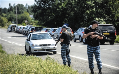 7月28日,來自澳大利亞和荷蘭的調(diào)查人員前往墜機(jī)現(xiàn)場途中,烏克蘭民間組織在其車隊后面封鎖道路。