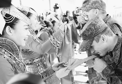2014年8月16日,在內(nèi)蒙古自治區(qū)朱日和訓(xùn)練基地火車站,來自俄羅斯的參演實兵部隊官兵在歡迎儀式上接受蒙古族傳統(tǒng)迎賓禮。