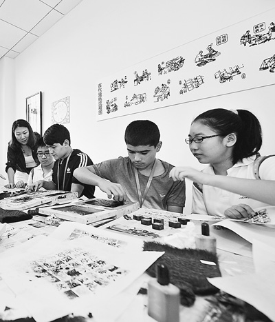 2014年8月14日,上合組織成員國首批中學(xué)生交流夏令營來到天津。圖為來自塔吉克斯坦的中學(xué)生與中國學(xué)生一起體驗活字印刷術(shù)。
