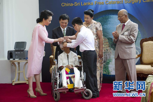 ????在兩國元首夫人共同見證下,許鵬飛為一位接受復明手術(shù)的斯里蘭卡白內(nèi)障患者揭開紗布。彭麗媛和施蘭蒂向在場的斯里蘭卡復明患者致以問候和祝福。彭麗媛向斯方贈送白內(nèi)障手術(shù)儀器,鼓勵“中斯友好光明行”活動繼續(xù)譜寫中斯友好交往的佳話。
