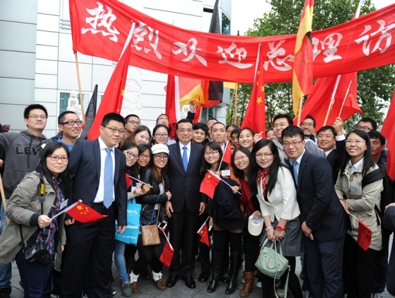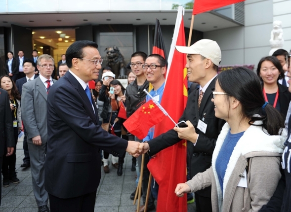 使館主樓外,還有不少中國(guó)留學(xué)生。他們打著“歡迎總理訪德”的橫幅,揮舞著中德兩國(guó)的國(guó)旗。見到克強(qiáng)總理走來,他們一下子圍了上去,爭(zhēng)相與克強(qiáng)總理握手。