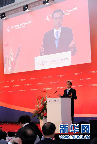 ??? 當?shù)貢r間10月11日中午,國務院總理李克強在漢堡出席中歐論壇漢堡峰會第六屆會議并發(fā)表題為《樹立互利共贏的新標桿》的主旨演講。新華社記者 饒愛民 攝