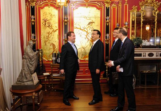 夕陽(yáng)西下,秋意闌珊。梅德韋杰夫早早在官邸門(mén)口迎候克強(qiáng)總理,并請(qǐng)他來(lái)到金碧輝煌的“中國(guó)廳”用餐。