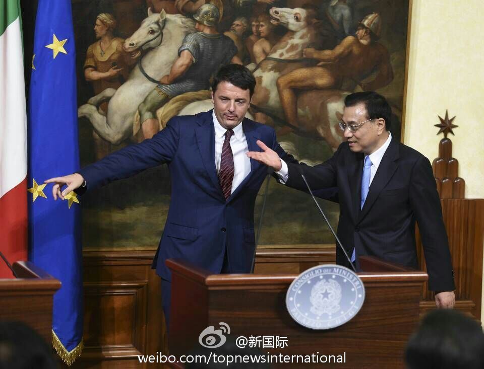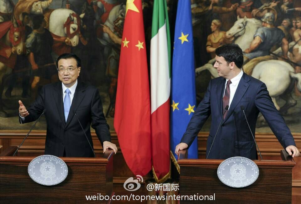 ??? 新華網(wǎng)北京10月15日電 據(jù)新華社“新國際”微博報道,國務院總理李克強14日與意大利總理倫齊在意總理府共同會見記者。李克強說,很高興來到不是一天建成的羅馬,中方不追求對意貿(mào)易順差,對擴大中意貿(mào)易合作規(guī)模充滿信心,愿與意方繼續(xù)深挖務實合作。即將簽署的協(xié)議規(guī)模高達80億歐元,這說明貿(mào)易投資規(guī)模還會擴大。?