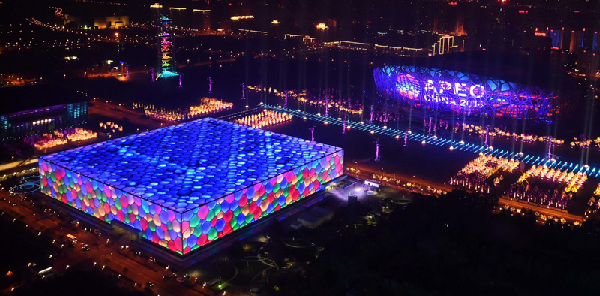 17時40分許,水立方和鳥巢的彩燈已經(jīng)在夜色中閃亮。當(dāng)晚,國家主席習(xí)近平和夫人彭麗媛在北京國家游泳中心(水立方)舉行宴會,歡迎出席APEC會議的各成員經(jīng)濟(jì)體領(lǐng)導(dǎo)人或代表及配偶。