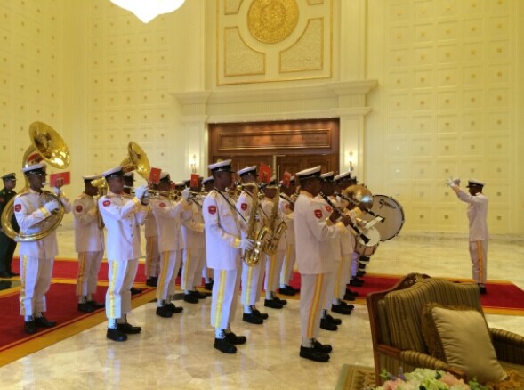 11月14日,緬方軍樂隊在為李克強(qiáng)總理舉行的歡迎午宴上奏響兩國國歌。