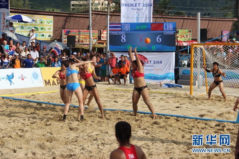 ??? 11月16日,中國(guó)沙灘手球運(yùn)動(dòng)員宮艷(左二)在比賽中擲球瞬間。中國(guó)體育代表團(tuán)16日在泰國(guó)普吉舉行的第四屆亞洲沙灘運(yùn)動(dòng)會(huì)上勇奪2枚金牌和2枚銅牌。當(dāng)天比賽全部結(jié)束時(shí),中國(guó)隊(duì)以3金2銀5銅的成績(jī)暫列獎(jiǎng)牌榜第五。新華社發(fā)(塔納攝)