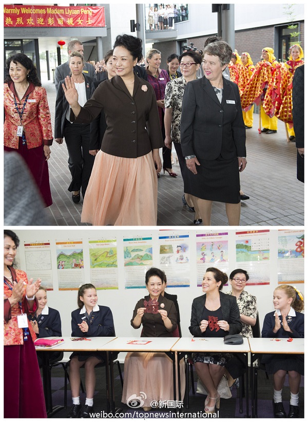 ??? 新華網(wǎng)北京11月19日電 據(jù)新華社“新國際”微博報道,習近平主席夫人彭麗媛19日在悉尼參觀育文武女子學校,在舞龍隊引導下來到孔子課堂?!鞍兹找郎奖M……”16名女孩朗誦《登鸛雀樓》,還學打中國結(jié)、制作剪紙、繡織漢字“中澳友誼長存”。彭麗媛拿起剪刀,剪出一個“福”字。?