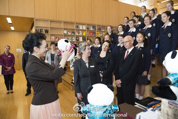 ??? 桌上擺放著彭麗媛向?qū)W校贈送的中英文雙語書籍和幾只毛茸茸大熊貓玩具。她拿起一只對孩子們說:“這是大家最喜歡的大熊貓。我這幾天抱了考拉、袋獾,它們非常可愛。大熊貓是中國國寶,也很可愛。希望你們學好中文,到中國去,看看真正的大熊貓。”