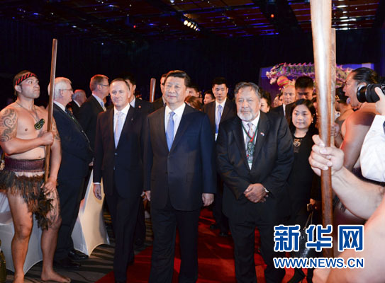 ????習(xí)近平和夫人彭麗媛抵達(dá)時(shí),新西蘭總理約翰·基夫婦迎接,毛利族代表以傳統(tǒng)方式歡迎。在毛利族勇士和中國(guó)舞龍引領(lǐng)下,習(xí)近平和彭麗媛步入大廳,全場(chǎng)起立鼓掌。毛利族青年用歌聲表達(dá)喜悅和友誼。