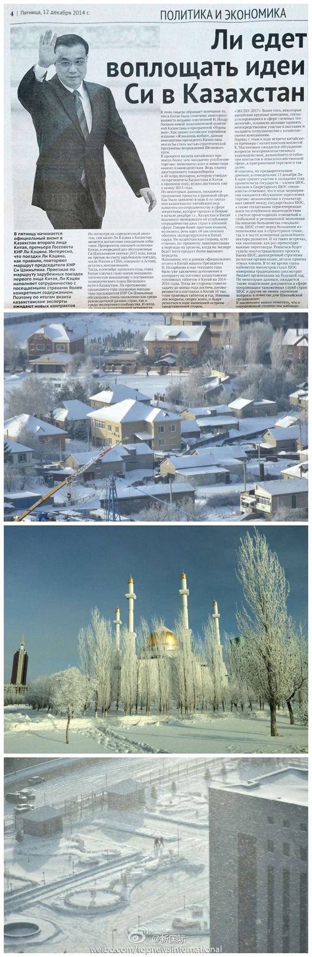????新華網(wǎng)北京12月13日電 據(jù)新華社“新國際”微博報道,哈薩克斯坦首都阿斯塔納冰天雪地,當(dāng)?shù)馗鹘鐚羁藦妬碓L的期待卻相當(dāng)熱切。總統(tǒng)府、總理府工作人員周末都在加緊籌備。哈通社記者穆卡諾夫說,中國總理來訪對他們來說是大新聞,他和同事將全程報道。他很關(guān)心哈中合作,希望中國的發(fā)展和經(jīng)驗?zāi)軒椭冒l(fā)展。