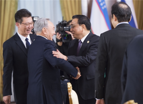 ????(納扎爾巴耶夫總統(tǒng)在集體會(huì)見(jiàn)上合組織成員國(guó)總理、秘書長(zhǎng)和地區(qū)反恐機(jī)構(gòu)執(zhí)委會(huì)主任時(shí),與克強(qiáng)總理相談甚歡,攝影記者:黃敬文)
