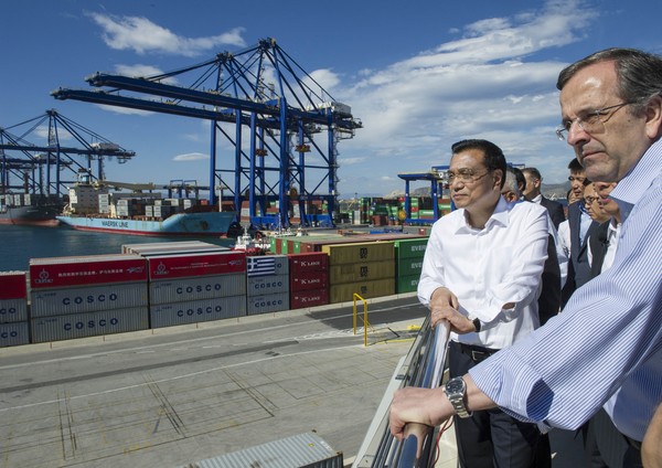 ?。?月20日,克強(qiáng)總理與希臘總理薩馬拉斯共同考察中國(guó)遠(yuǎn)洋運(yùn)輸集團(tuán)比雷埃夫斯集裝箱碼頭,攝影記者:王曄 )
