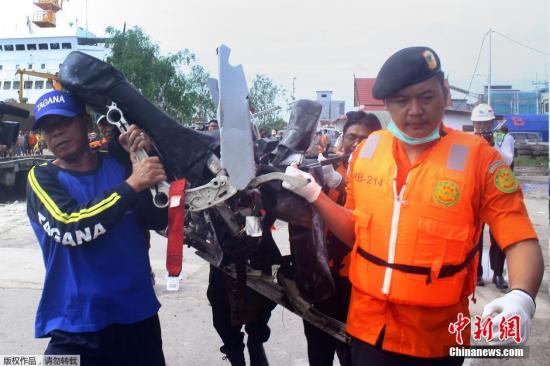 當(dāng)?shù)貢r(shí)間2015年1月19日,印尼加里曼丹,庫(kù)邁港,印尼國(guó)家搜救機(jī)構(gòu)工作人員正抬著一個(gè)打撈上來(lái)的飛機(jī)座椅殘骸。