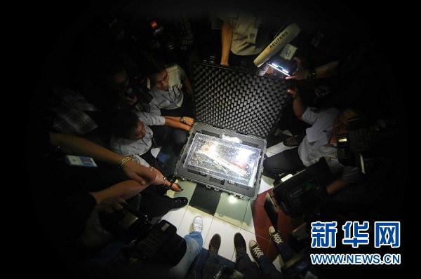 ??? 1月12日,在印度尼西亞雅加達(dá),工作人員打開裝有亞航失事客機(jī)黑匣子的箱子。印度尼西亞國家交通安全委員會主席塔唐·庫爾尼亞迪12日說,搜救人員當(dāng)天早上打撈起的失事亞航客機(jī)其中一個黑匣子——飛行數(shù)據(jù)記錄器狀態(tài)良好。新華社發(fā)(阿貢攝)