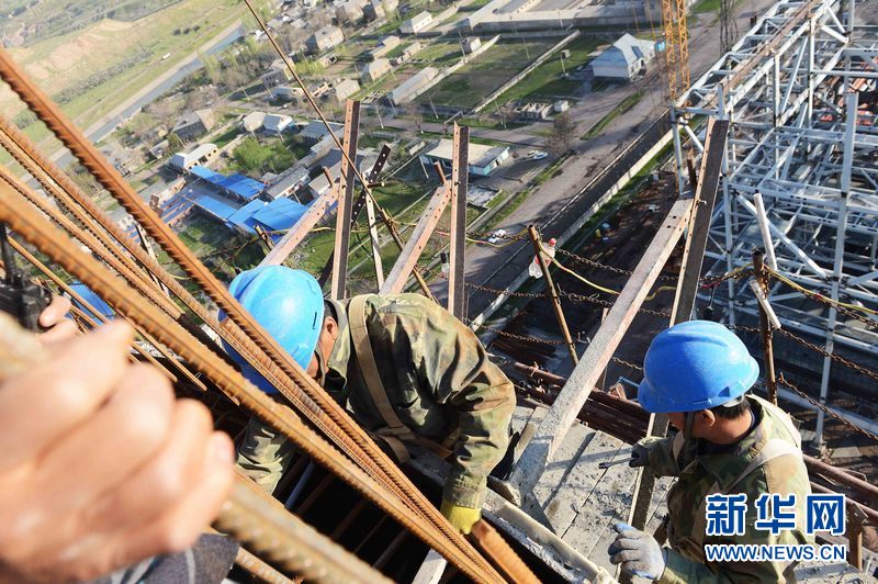 ????烏茲別克斯坦安格連(市)電廠煙囪施工現(xiàn)場,來自中國能建集團(tuán)黑龍江省火電第一工程有限公司的工人在作業(yè)。新華網(wǎng)發(fā) 記者沙達(dá)提 攝