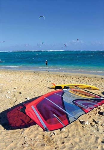 我們?cè)诹裟嵬膸滋鞎r(shí)間里風(fēng)浪都比較大,不過(guò)來(lái)到海邊卻發(fā)現(xiàn)海灘上依舊人聲鼎沸,原來(lái)好動(dòng)的法國(guó)人和一些歐美游客正利用風(fēng)浪玩起了刺激的海上運(yùn)動(dòng)。幾米高的海浪中早已有了十多名沖浪好手相繼嘗試挑戰(zhàn),雖然他們中的大部分只是業(yè)余愛(ài)好,并非職業(yè)沖浪選手,不過(guò)一招一式也是頗為認(rèn)真??拷0陡浇臏\水區(qū)則更多是風(fēng)帆、摩托艇、皮劃艇、海浪滑板等各項(xiàng)水上運(yùn)動(dòng)的世界,對(duì)于他們來(lái)說(shuō),大風(fēng)就是運(yùn)動(dòng)的動(dòng)力,海水就是運(yùn)動(dòng)的場(chǎng)地。一般島上的家庭都會(huì)趁著周末舉家開(kāi)車(chē)來(lái)到海邊,喜歡玩水的玩水,而其他家庭成員則在沙灘上聚餐或者聊天,如此融入大自然真是瀟灑。