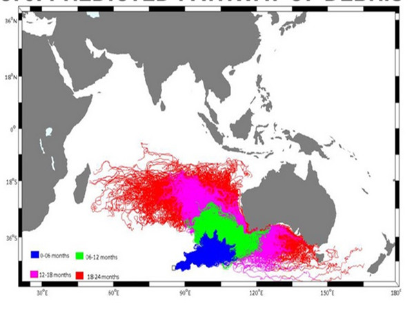 ?。ㄎ靼拇罄麃喆髮W(xué)研究人員繪制的殘骸可能漂流路徑圖,紅色為18-24個月可能出現(xiàn)殘骸的區(qū)域,粉色為12到18個月,綠色為6到12個月,藍(lán)色為六個月之內(nèi)。)