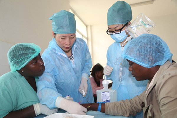 2014年12月10日,解放軍援塞醫(yī)療隊(duì)為中塞友好醫(yī)院由留觀中心轉(zhuǎn)型為留觀診療中心開展輸液培訓(xùn)活動(dòng)。這是中方隊(duì)員在教授塞方護(hù)理人員留置針的穿刺方法。 新華社發(fā)(戴欣 攝)