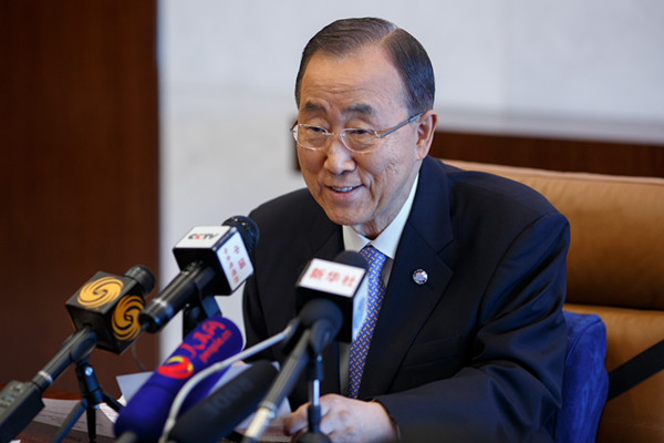 2015年8月28日,在紐約聯(lián)合國(guó)總部,聯(lián)合國(guó)秘書(shū)長(zhǎng)潘基文接受中國(guó)媒體聯(lián)合采訪。(新華社記者 李木子 攝)