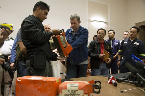 ↑2014年7月22日,馬來(lái)西亞調(diào)查人員(左)接過(guò)馬航MH17航班客機(jī)的黑匣子。
