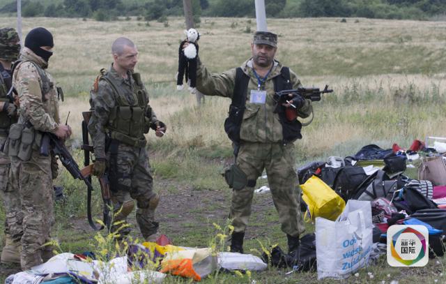 2014年7月18日,一名當(dāng)?shù)孛耖g武裝人員在烏克蘭頓涅茨克州格拉博夫附近的馬航客機(jī)墜機(jī)現(xiàn)場拿起一個(gè)玩具。新華社/美聯(lián)