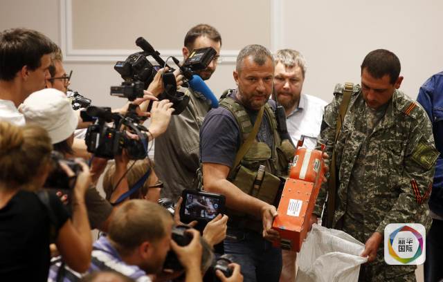 2014年7月22日凌晨,在烏克蘭頓涅茨克州,烏克蘭東部民間武裝代表正在向媒體展示黑匣子。烏克蘭東部民間武裝領(lǐng)導(dǎo)人、“頓涅茨克人民共和國”總理博羅代22日凌晨將馬航MH17航班客機(jī)黑匣子交給馬來西亞方面。新華社/路透