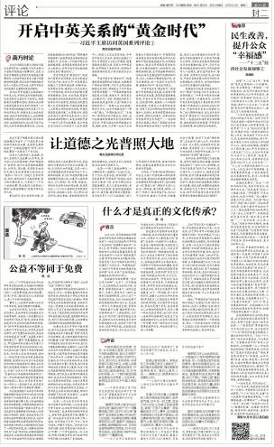 英國(guó)駐華大使吳百納連續(xù)用了四個(gè)“黃金”來(lái)形容習(xí)近平主席此次訪英的意義:“今年是中英關(guān)系的黃金年,這將是一次黃金訪問(wèn),它證明中英關(guān)系的發(fā)展處于黃金時(shí)期。訪問(wèn)將確立中英面向21世紀(jì)的全球伙伴關(guān)系,開(kāi)啟中英關(guān)系史上的黃金10年?!蔽覀兤诖⑾嘈牛@次為開(kāi)啟中英關(guān)系“黃金時(shí)代”而往的里程碑式訪問(wèn),一定能成功打造中英關(guān)系新格局、繪制兩國(guó)關(guān)系新藍(lán)圖、開(kāi)辟務(wù)實(shí)合作新前景、樹(shù)立國(guó)際合作新典范。(南方日?qǐng)?bào)評(píng)論員)