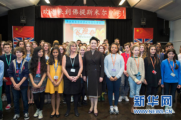 ??? 10月21日,國家主席習(xí)近平夫人彭麗媛在倫敦參觀福提斯米爾中學(xué)。這是彭麗媛同該校學(xué)生合影。 新華社記者 謝環(huán)馳 攝