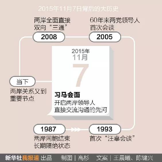 2015年11月7日,兩岸領(lǐng)導(dǎo)人習(xí)近平、馬英九將在新加坡會(huì)面,就推進(jìn)兩岸關(guān)系和平發(fā)展交換意見(jiàn)。這是兩岸關(guān)系發(fā)展史上具有里程碑意義的大事。(來(lái)源:新華社客戶端? 文字:陳鍵興、王晨曦)