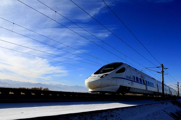 圖為2014年 12月13日,一列測(cè)試動(dòng)車在蘭新高鐵甘肅段疾馳 蔡增樂攝