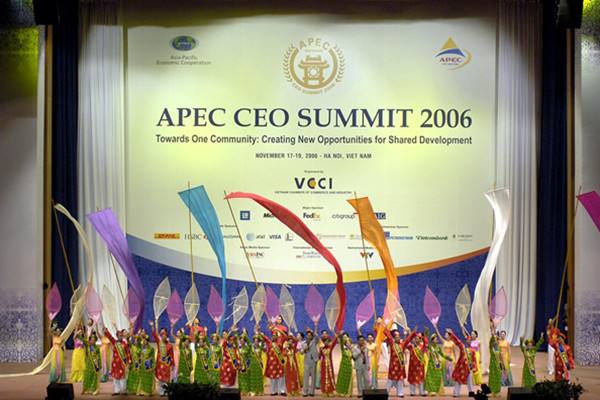 2006年11月17日,演員們?cè)谠侥鲜锥己觾?nèi)舉行的2006年APEC工商領(lǐng)導(dǎo)人峰會(huì)開幕式上表演。