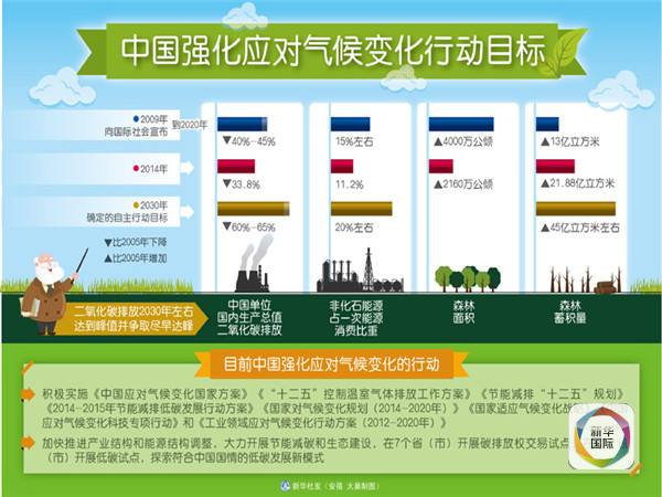 今年6月,中國正式向聯(lián)合國提交2020年后應(yīng)對氣候變化的“國家自主決定貢獻”:二氧化碳排放2030年左右達到峰值并爭取盡早實現(xiàn),單位國內(nèi)生產(chǎn)總值二氧化碳排放比2005年下降60%至65%,非化石能源占一次能源消費比重達到20%左右,森林蓄積量比2005年增加45億立方米左右。