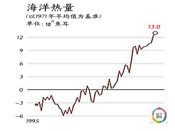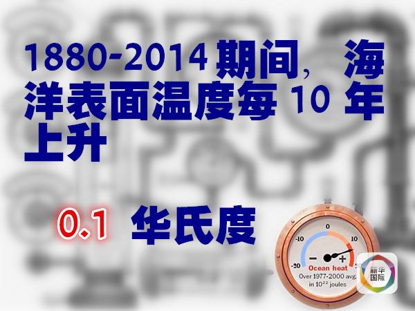 據(jù)美國獨(dú)立機(jī)構(gòu)氣候總站統(tǒng)計,從1880年到2014年,海洋表面溫度每10年平均升高0.1華氏度。如果按照海洋儲存熱量的變化來看,以10的22次方焦耳為單位、1971年為基準(zhǔn),1955年海洋儲存熱量在負(fù)3個單位以下,2014年則超過13個單位。