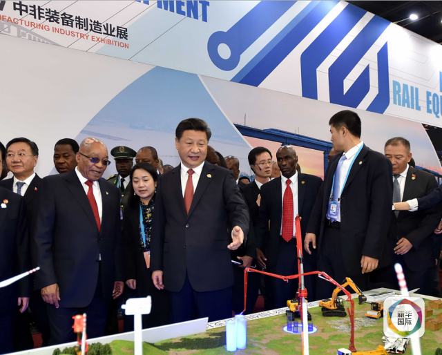 12月4日,國(guó)家主席習(xí)近平在約翰內(nèi)斯堡同南非總統(tǒng)祖馬,非盟輪值主席、津巴布韋總統(tǒng)穆加貝共同出席中非裝備制造業(yè)展開幕式并為展覽剪彩。(新華社記者李濤攝)