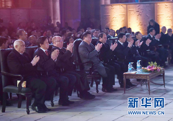 1月21日,國(guó)家主席習(xí)近平和埃及總統(tǒng)塞西在古老的盧克索神廟廣場(chǎng)共同出席中埃建交60周年慶?;顒?dòng)暨2016中埃文化年開(kāi)幕式。新華社記者張鐸攝